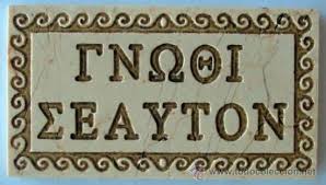 El seu títol és un aforisme que apareix escrit en el Temple d'Apol.lo en Delfos i del que no està molt clara la seua autoria.
